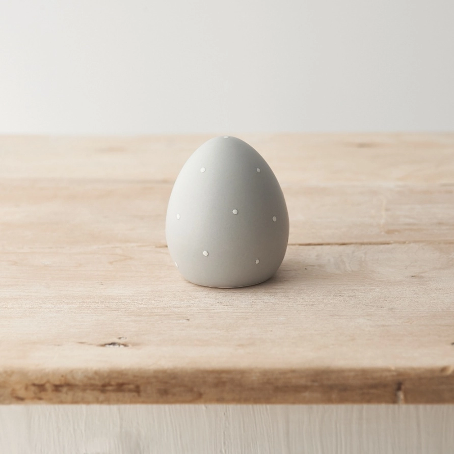 Uma elegante decoração de ovo com bolinhas cinza e branco.