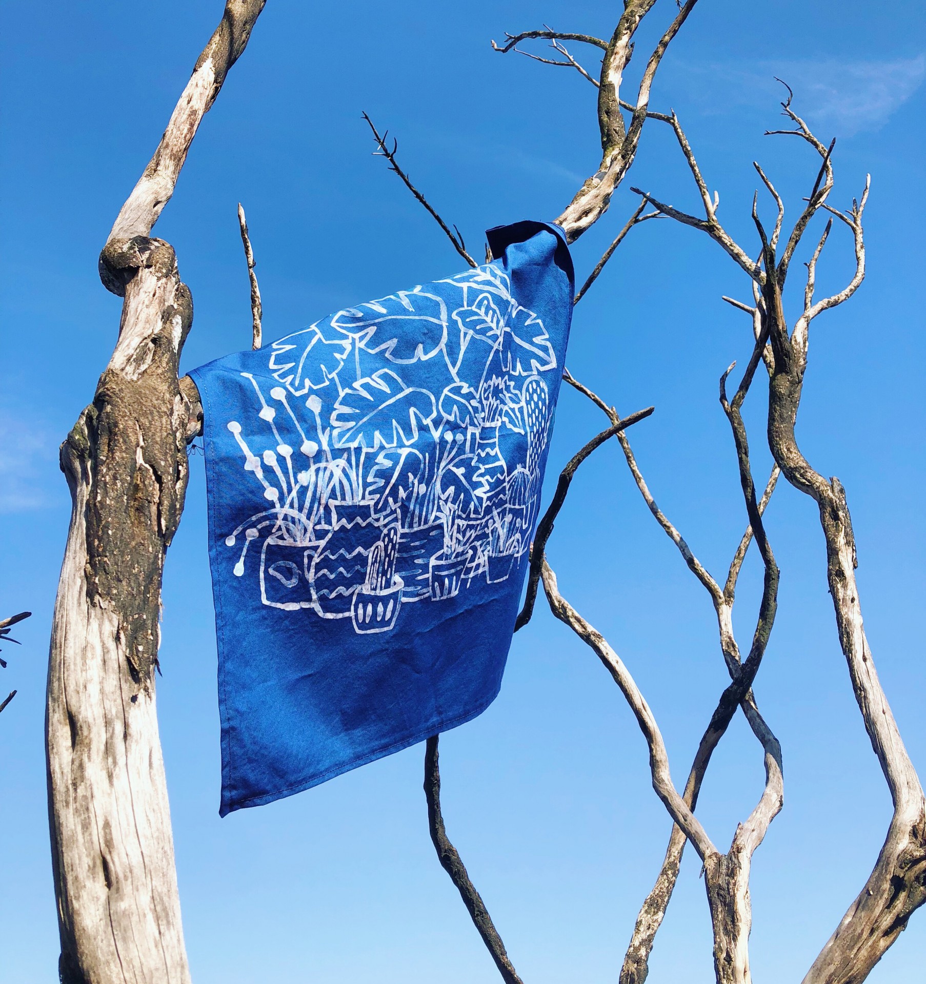 Feita à mão, 100% algodão orgânico com banho de tingimento índigo e haste de madeira incluída.