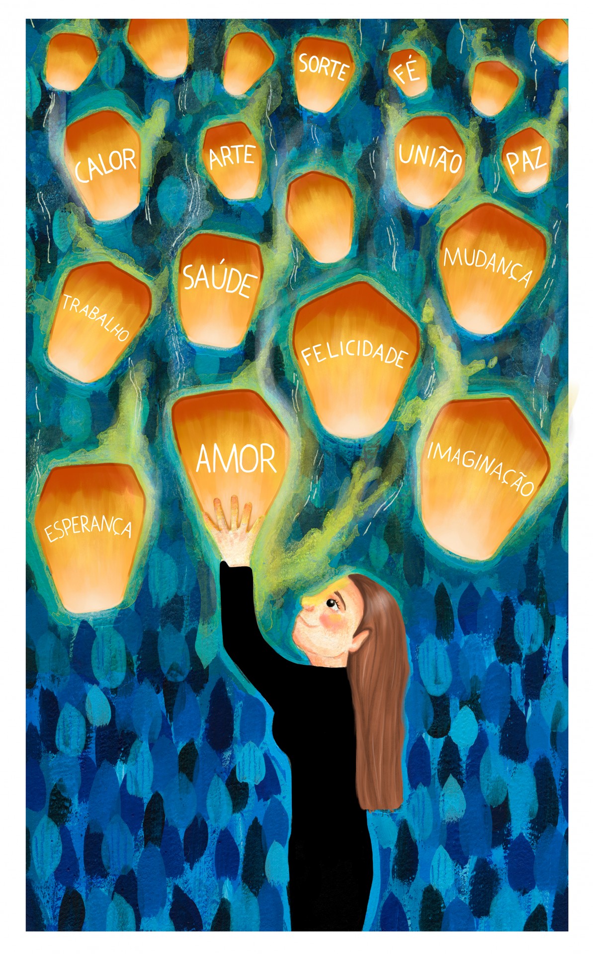A ilustração é o resultado de um ano atípico, um ano invulgar somado a uma vontade e esperança que o próximo nos deixe viver novamente. Decidi representar os meus e os desejos da maioria através de palavras enviadas pelo ar em lanternas de ar quente para que que cheguem o mais longe possível e a muitas pessoas. A roupa preta utilizada pela figura representada simboliza o luto que vamos fazer a este ano para dar as boas vindas a um ano cheio de cor, um ano mais quente, mais acolhedor.