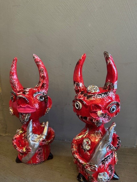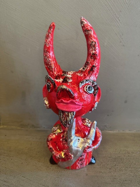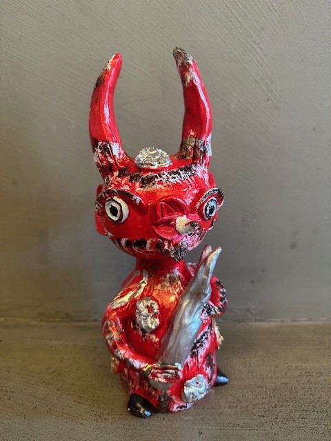 • Figura vermelha decorativa com chifres e olhos grandes segurando objeto prateado