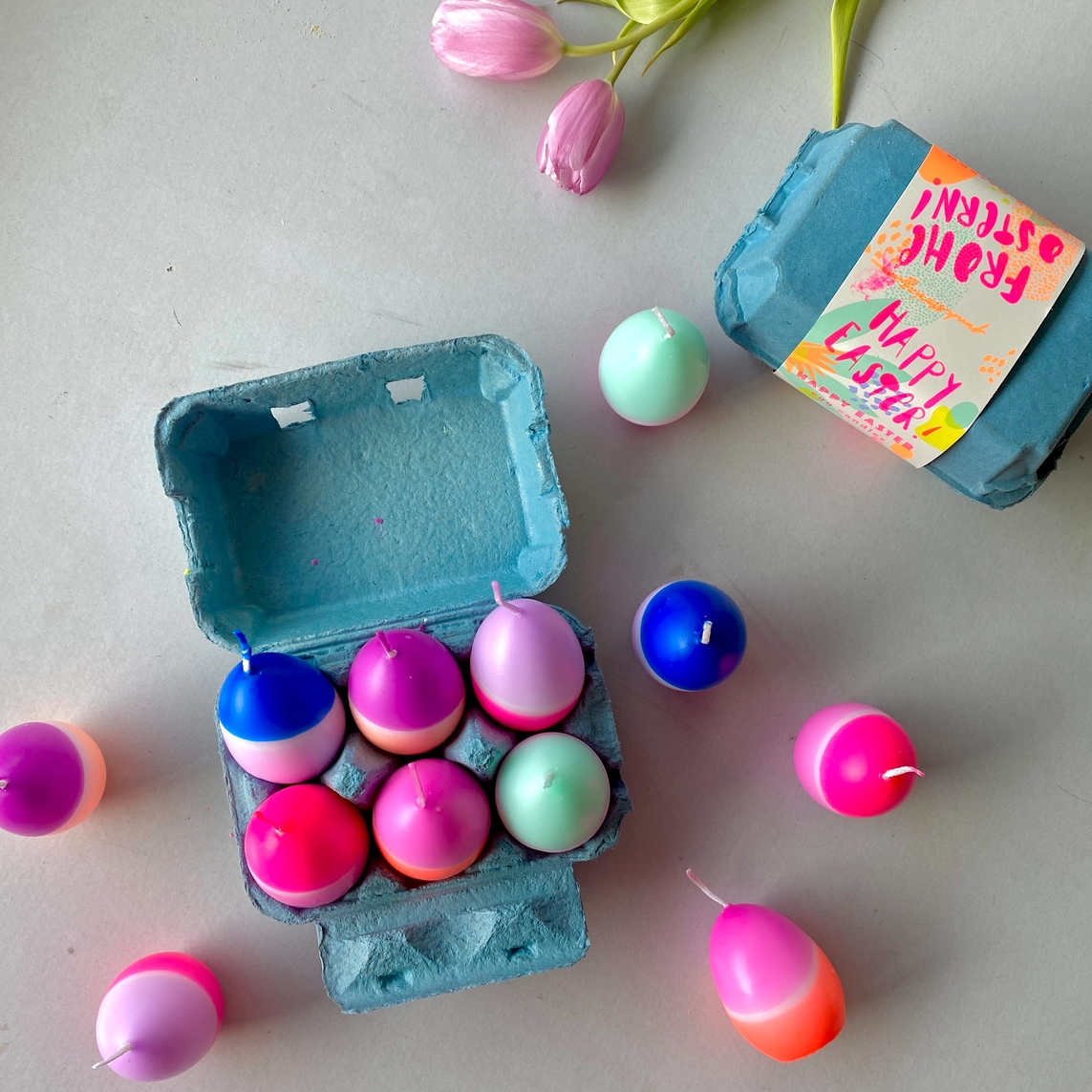 • Caixa azul com velas ovais coloridas e etiquetas festivas, com tulipas cor-de-rosa ao fundo.