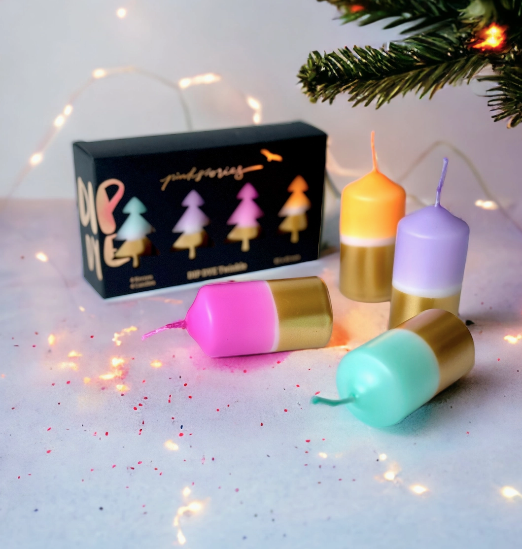 • Conjunto de velas de Natal coloridas com base dourada e caixa preta