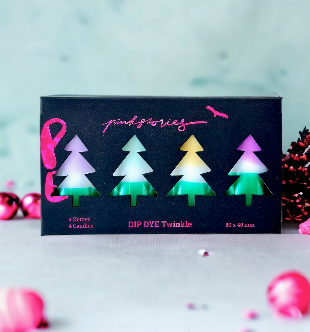 • Caixa preta com quatro velas em forma de árvore de Natal multicoloridas