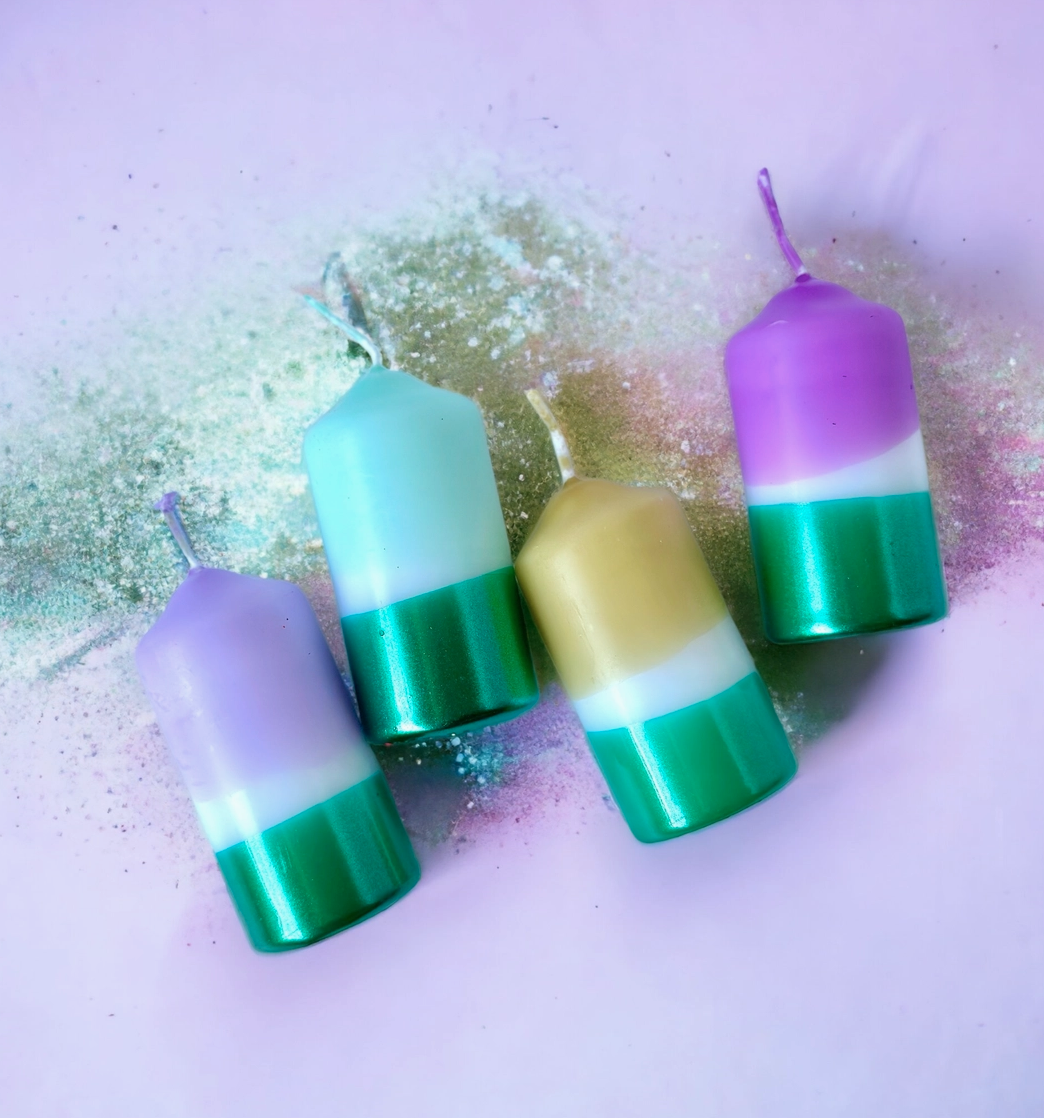 • Conjunto de quatro velas bicolores com base verde metálica e parte superior colorida em tons pastel