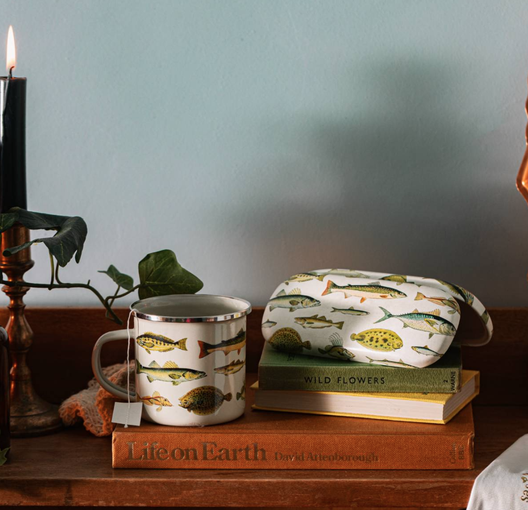 Caneca e estojo com estampa de peixes sobre livros numa mesa de madeira com vela acesa ao lado