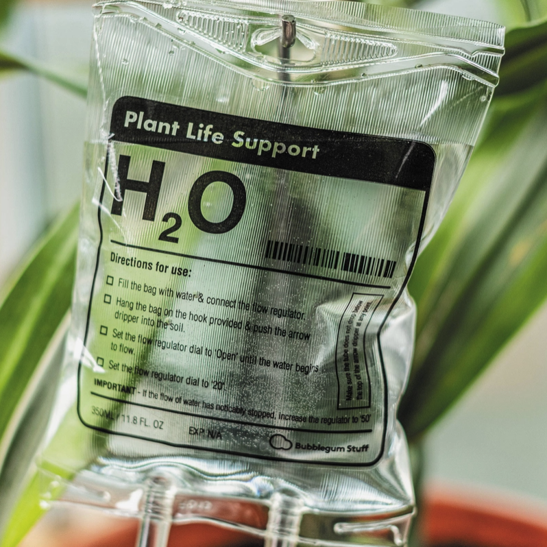 • Saco plástico transparente com líquido e rótulo preto para suporte de vida de plantas