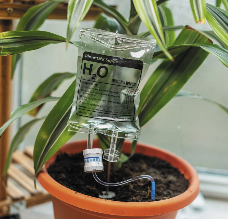 • Frasco plástico transparente com líquido suspenso sobre vaso de planta
