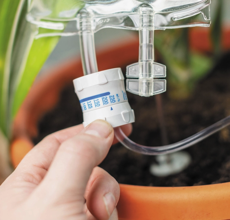 • Válvula ajustável de irrigação automática branca em planta de vaso de barro