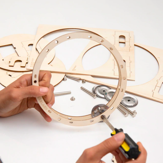 • Mãos a montar peças de madeira redondas com parafusos e chave de fendas sobre mesa branca