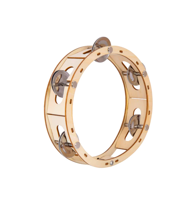 • Pandeireta de madeira com pratos metálicos prateados
