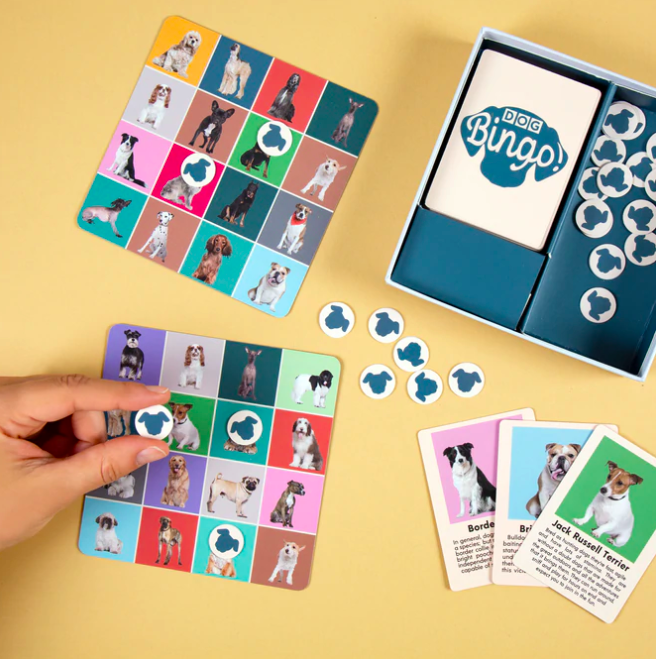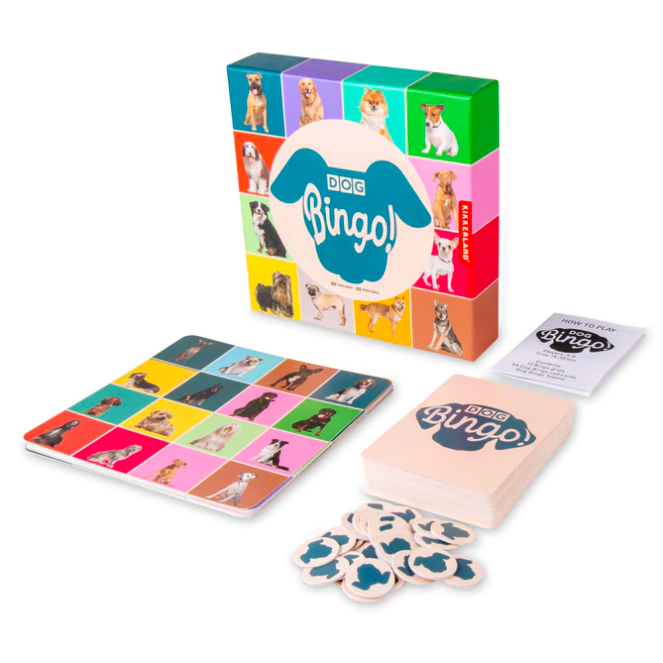 Contains: 54 dog breed pictures, 12 bingo board cards, 54 dog cards, 100 game pieces, instructions