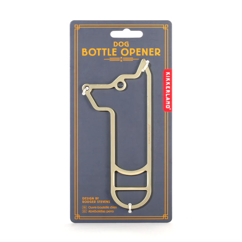 • Abridor de garrafas em formato de cão numa embalagem cinzenta com texto amarelo e vermelho