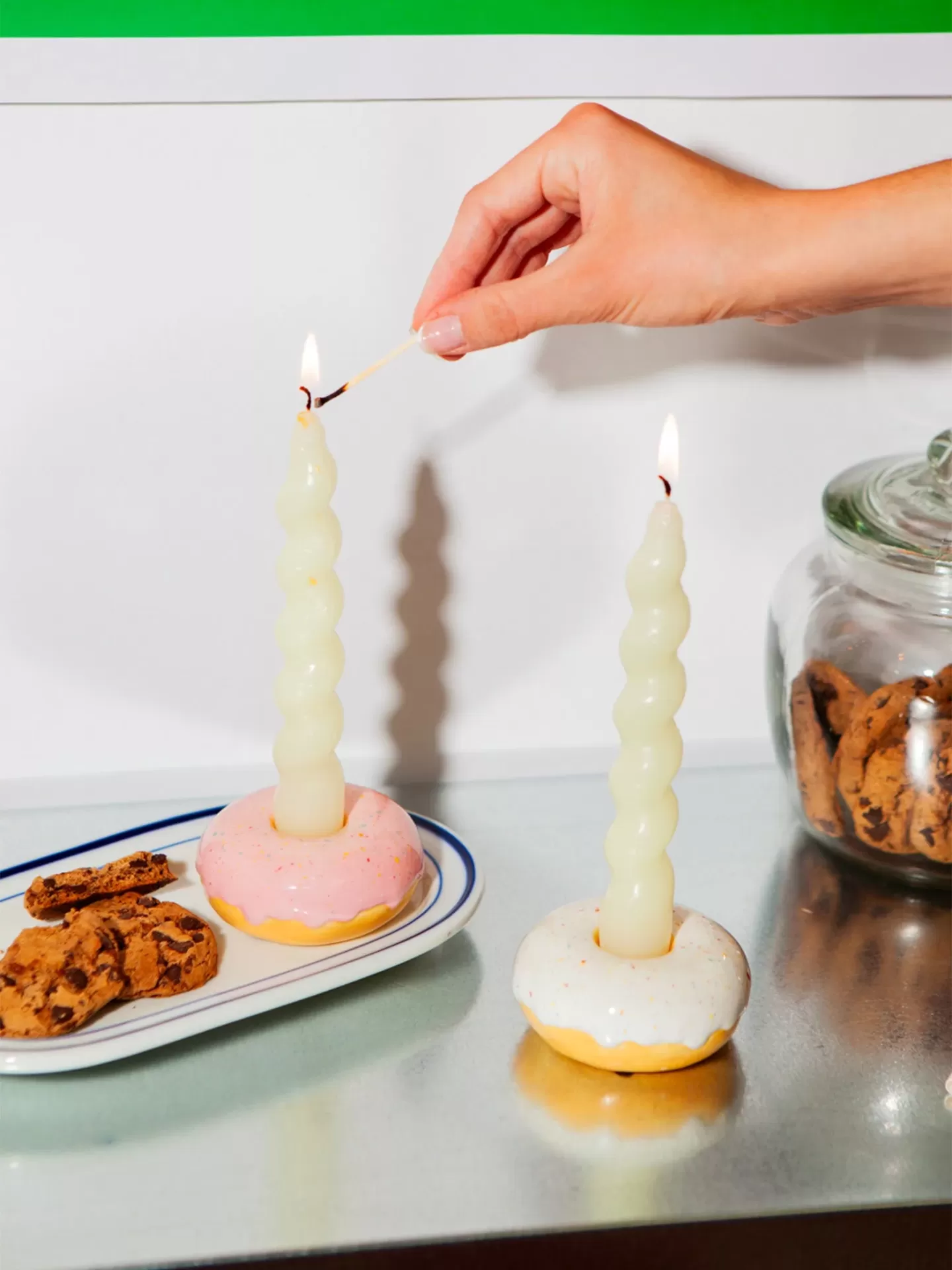• Castiçais em forma de velas onduladas com base de donuts glacados e biscoitos de chocolate próximos