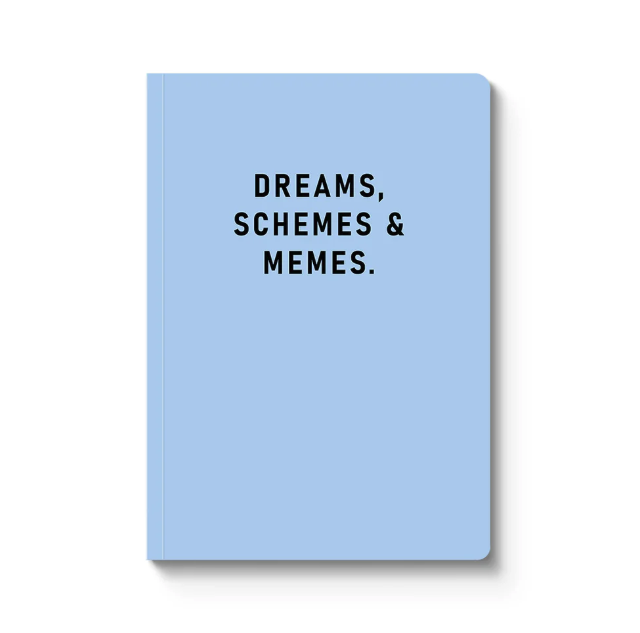 Caderno azul claro com texto preto DREAMS, SCHEMES & MEMES.