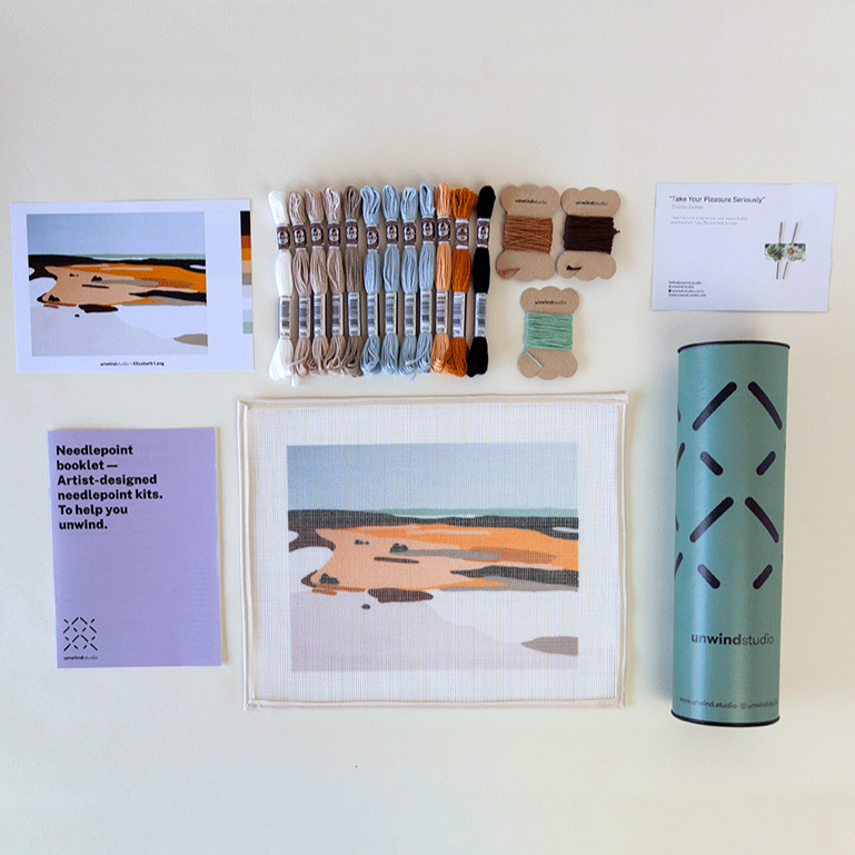The artwork in the "Dunes no. 7" needlepoint kit is part of a series done to reflect the beauty of the sand dunes in coastal Florida along the Gulf of Mexico. In an area protected from footsteps, these dunes grow wild and are home to many plants, birds, and wildlife. The earthy and sandy tones create a subtle and calming view of the landscape, transporting you there while you stitch!