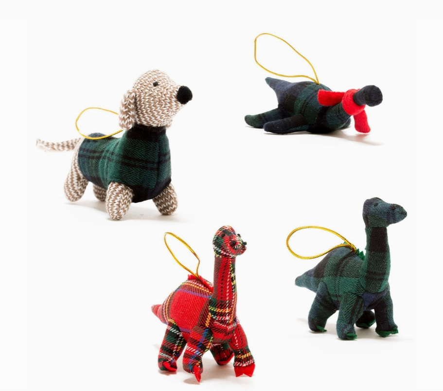 • Quatro ornamentos de animais de tecido com padrões xadrez e alças de pendurar amarelas.