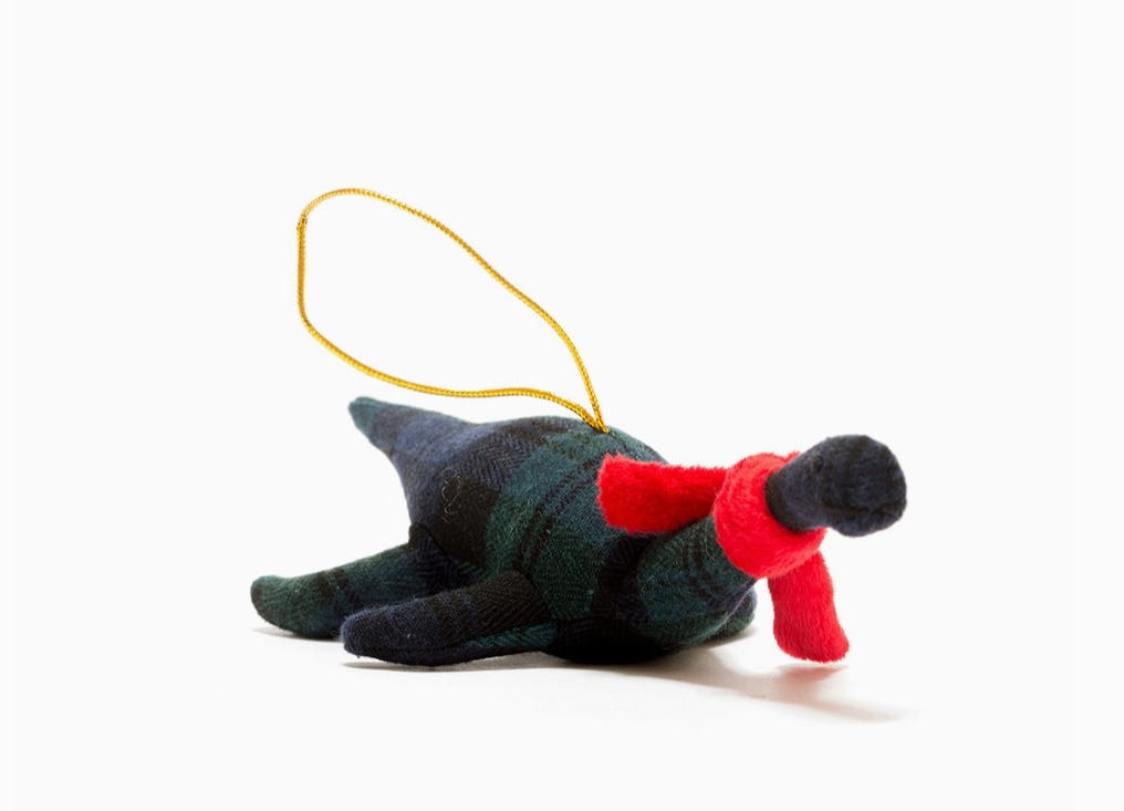 • Quatro ornamentos de animais de tecido com padrões xadrez e alças de pendurar amarelas.