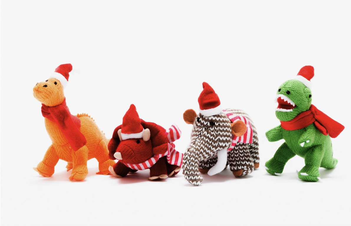 • Quatro peluches festivos com gorros e cachecóis vermelhos num fundo branco