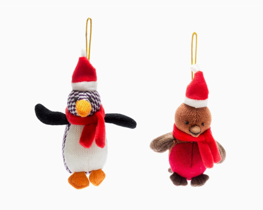 • Dois bonecos de pelúcia natalícios, pinguim e pássaro, com cachecóis e gorros vermelhos.