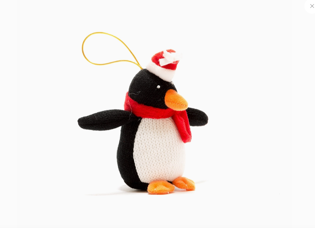• Pinguim de peluche tricotado preto e branco com cachecol vermelho e chapéu de Natal