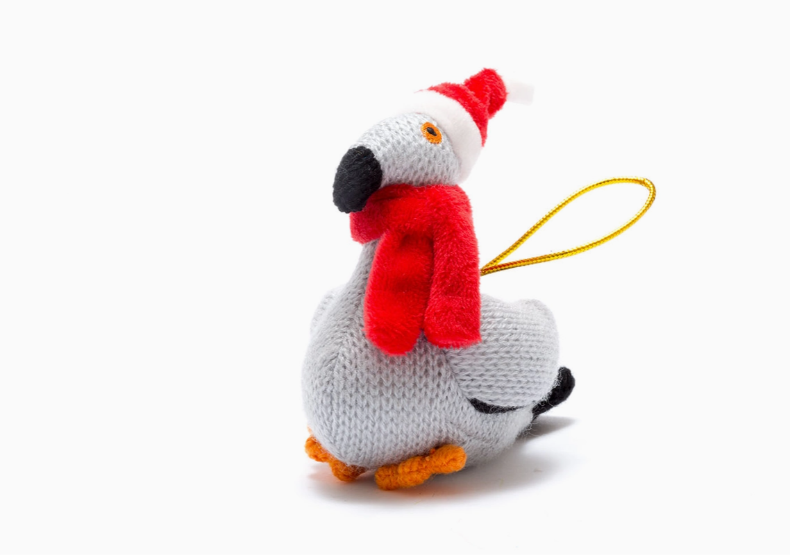 • Boneco decorativo de ave em malha cinzenta com cachecol e chapéu de Natal vermelho