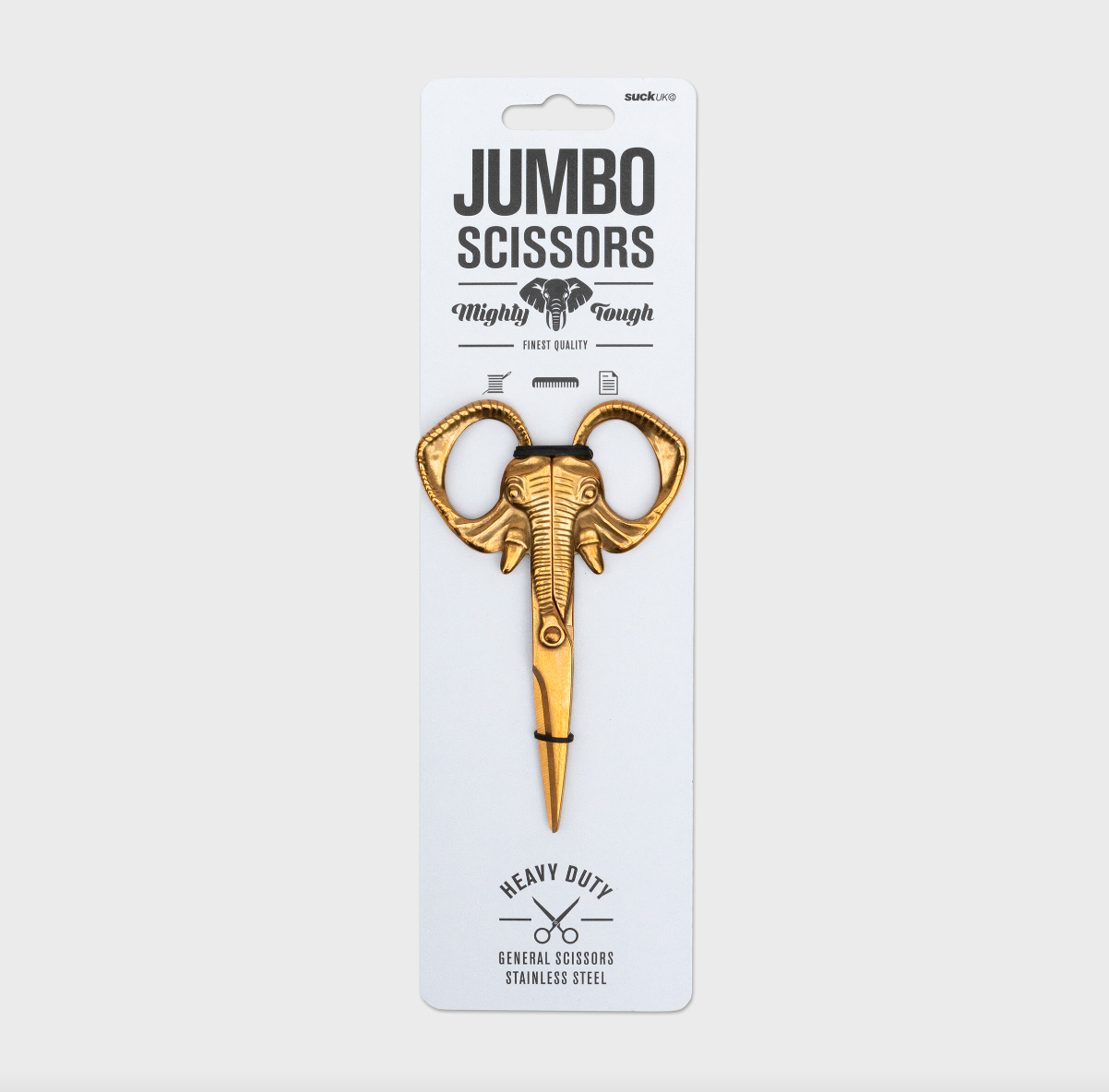 • Tesoura jumbo dourada em forma de elefante em embalagem branca com texto