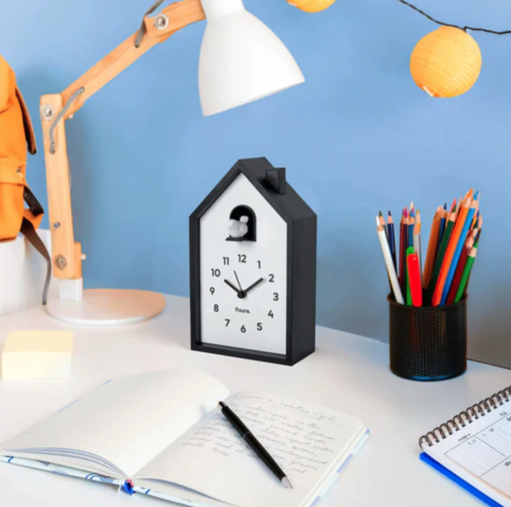 • Relógio de mesa formato casa preto e branco com lâmpada, lápis coloridos e cadernos numa mesa branca