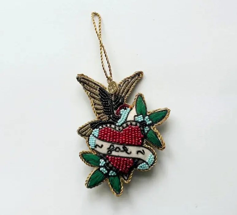 • Enfeite bordado em forma de coração com aves e folhas