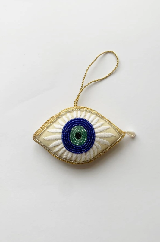 • Enfeite em forma de olho bordado com contas coloridas e cordão dourado