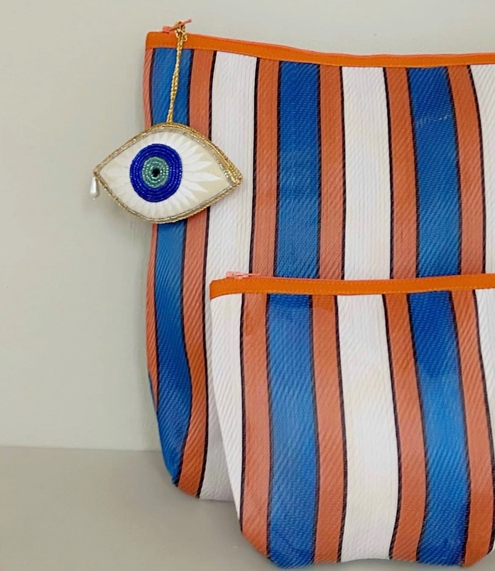 • Bolsas riscas azul, cobre e branco com pendente olho em miçangas