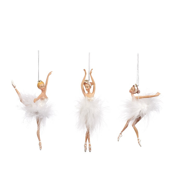 Três bonecas de bailarina em saias de penas brancas suspensas.