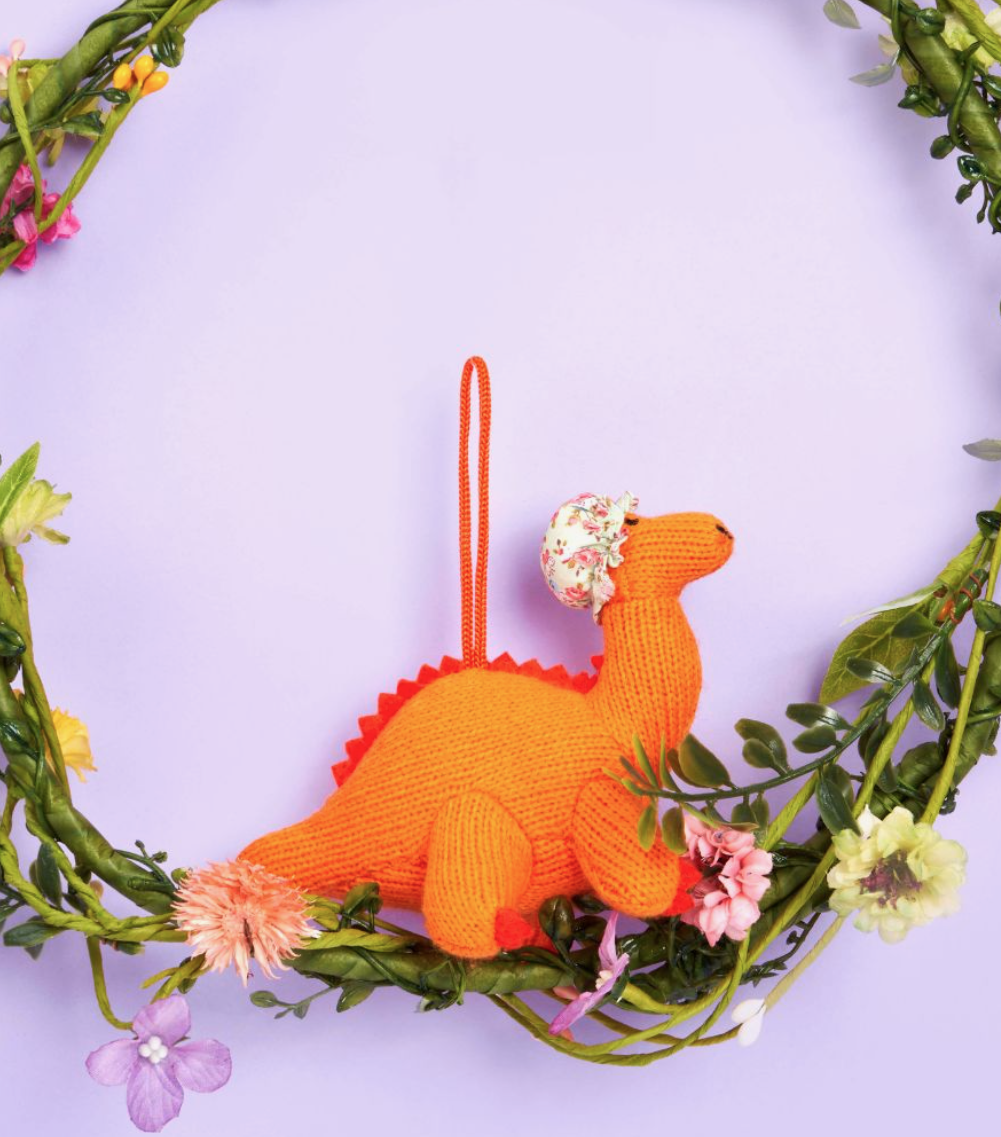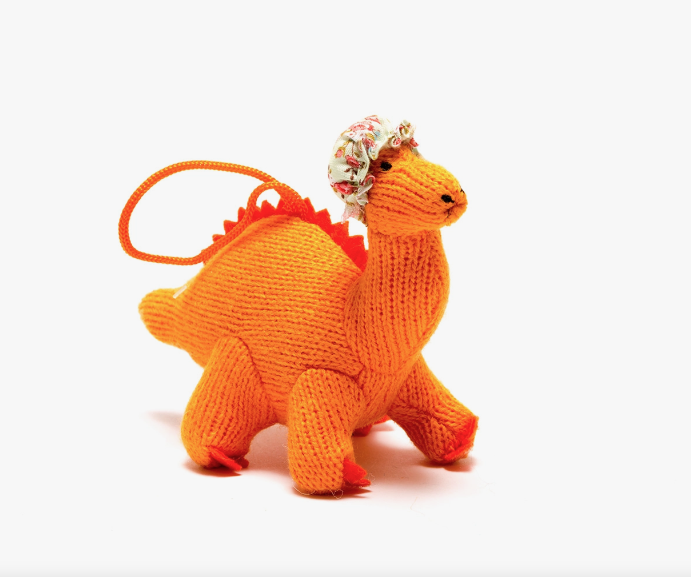 • Brinquedo de dinossauro laranja com gorro floral e corda para pendurar