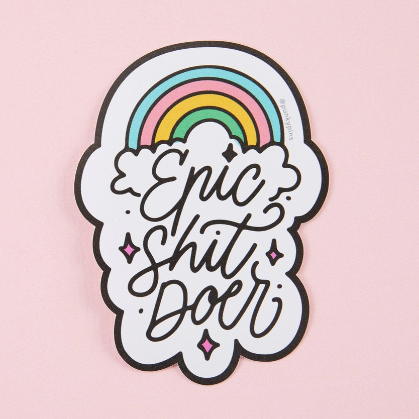 • Adesivo com arco-íris e texto 'Epic shit doer' em fundo branco e rosa.