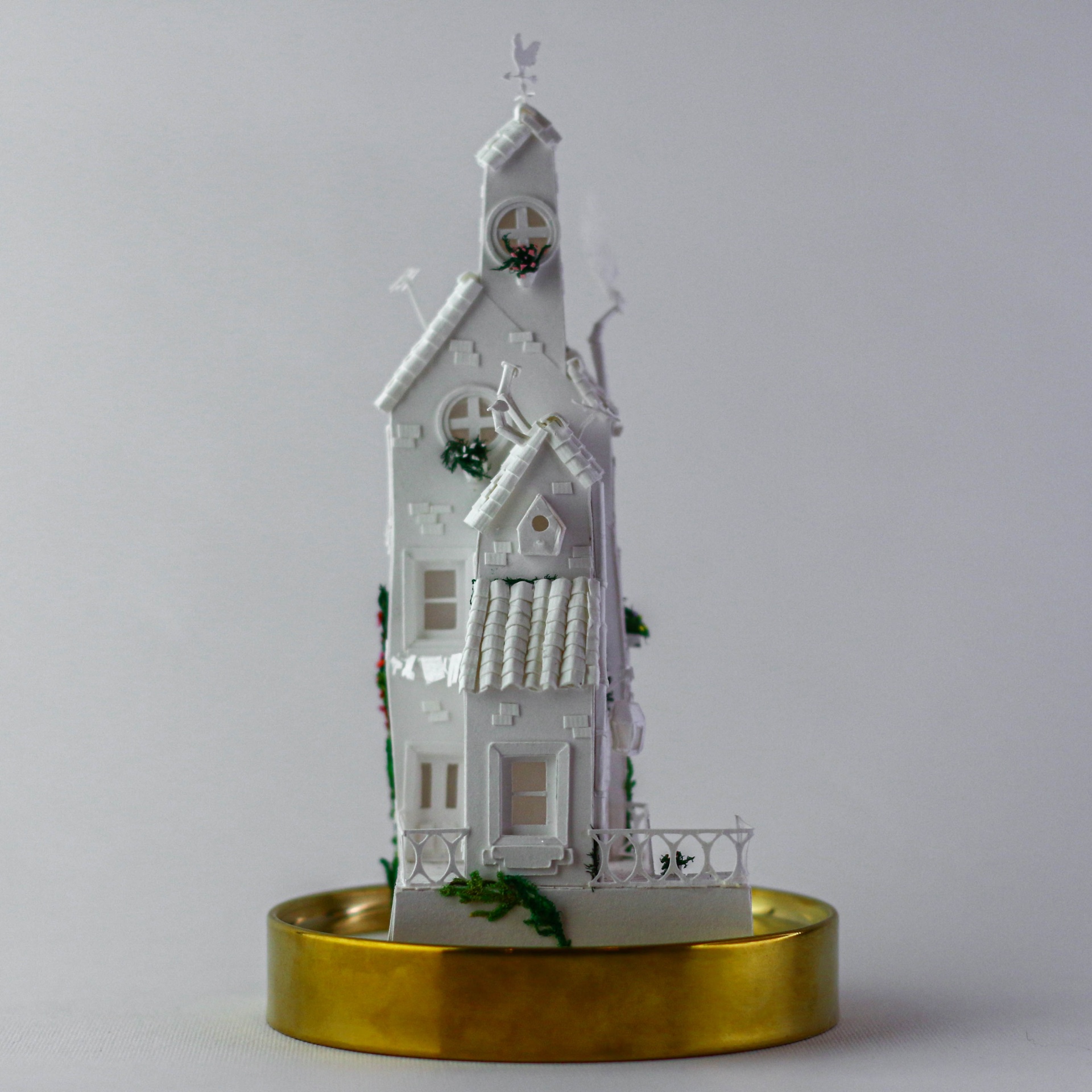 • Miniatura de casa branca decorativa com base dourada