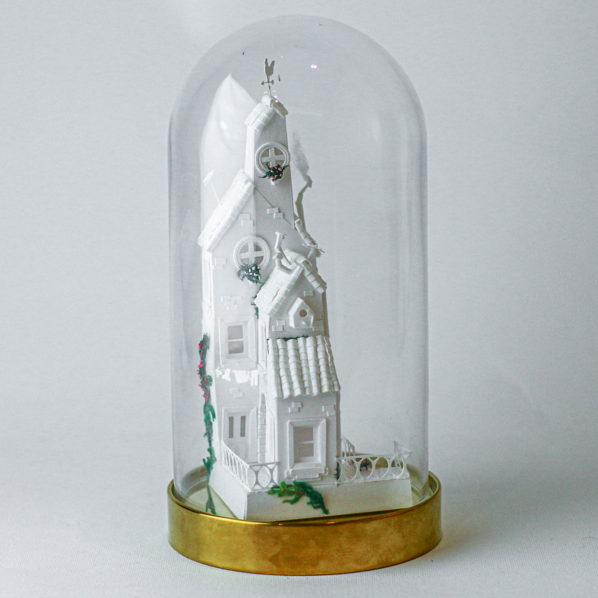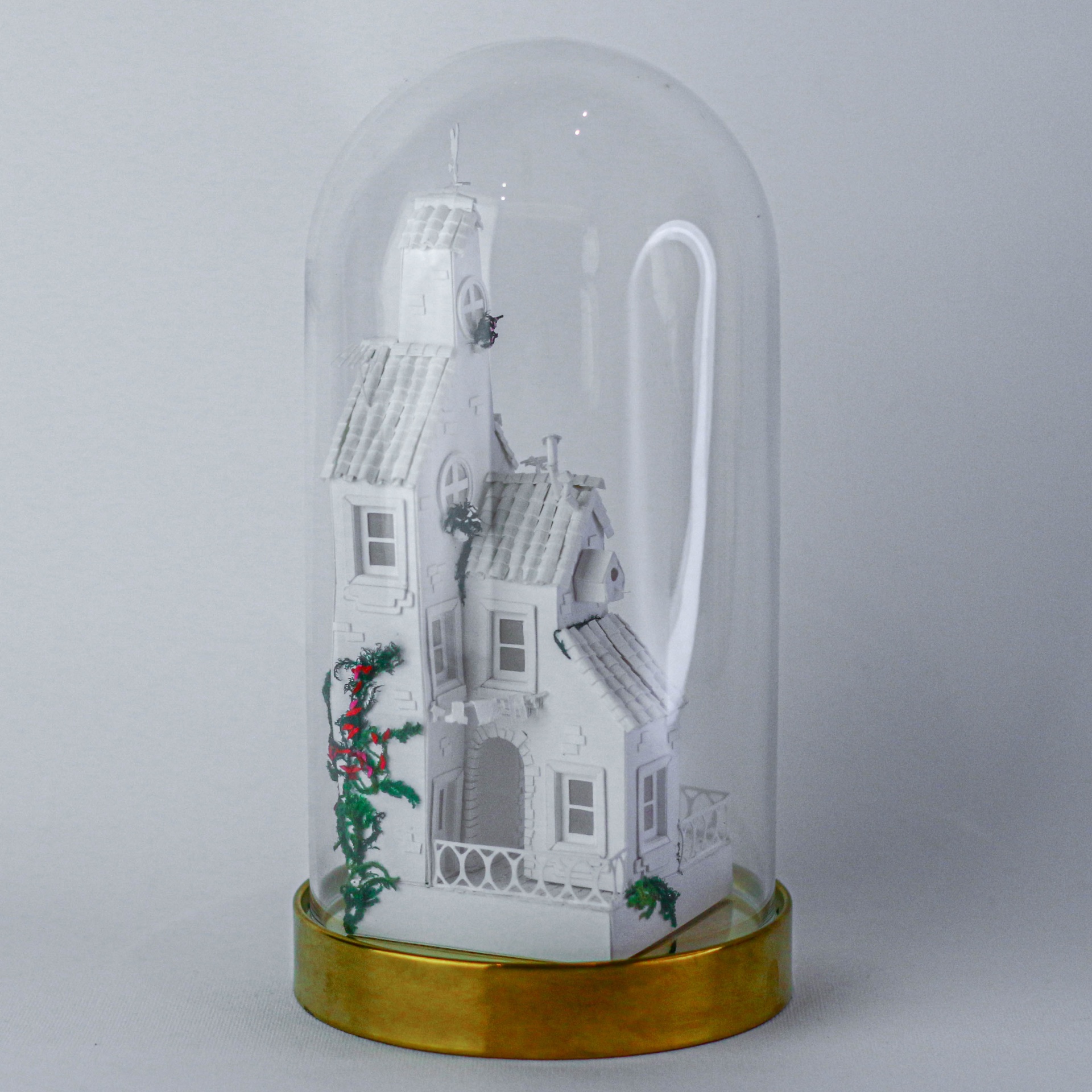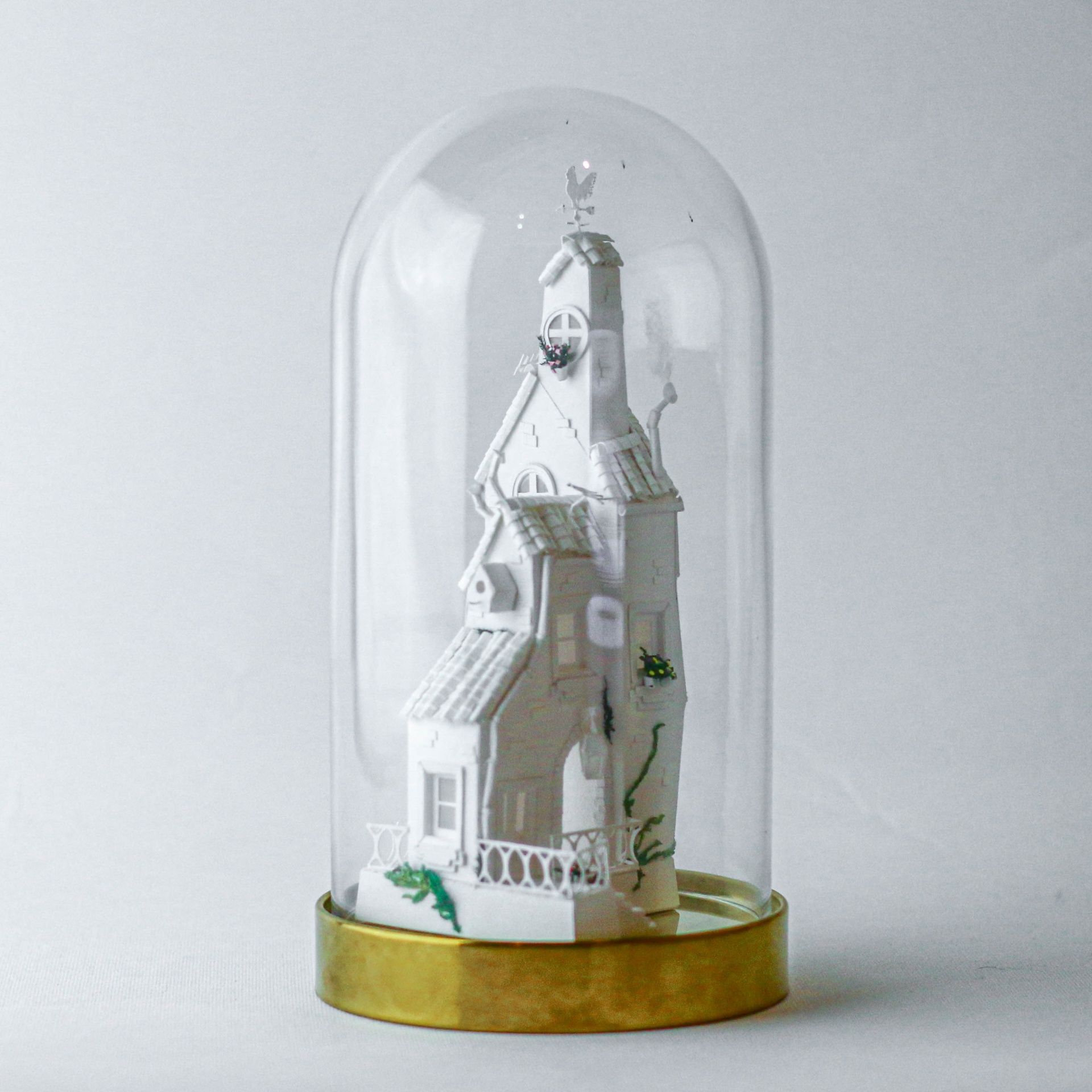 • Pequena casa branca dentro de cúpula de vidro com base dourada