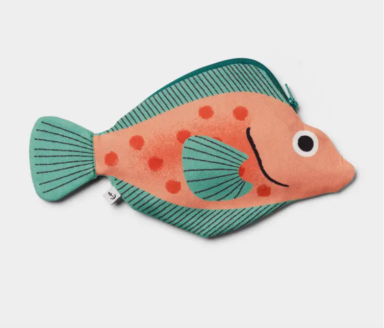• Estojo em forma de peixe cor salmão com nadadeiras e cauda verdes, com fecho de correr