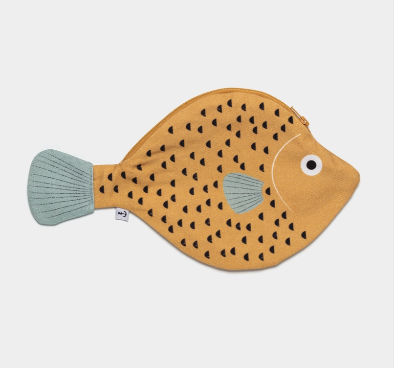 • Estojo em forma de peixe amarelo com escamas pretas e nadadeiras cinzentas