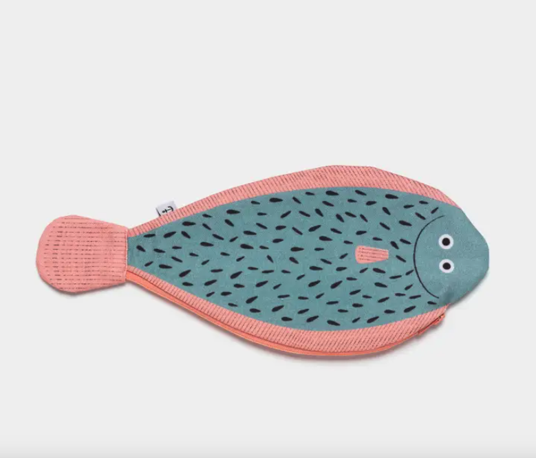 Almofada ou brinquedo em forma de peixe azul-verde com bordas cor-de-rosa