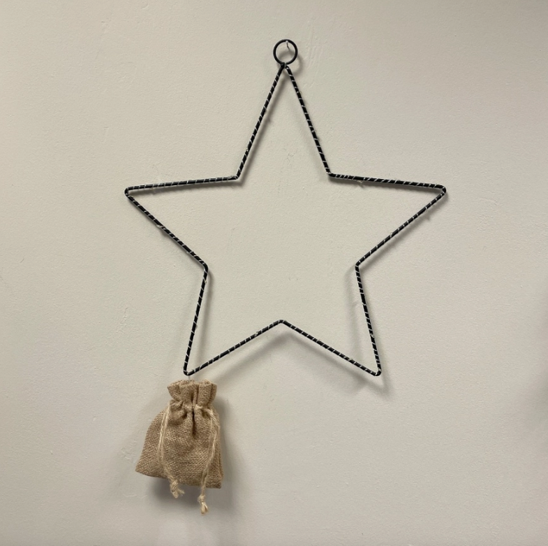 • Estrela decorativa de metal preto com saco de tecido castanho pendurada na parede