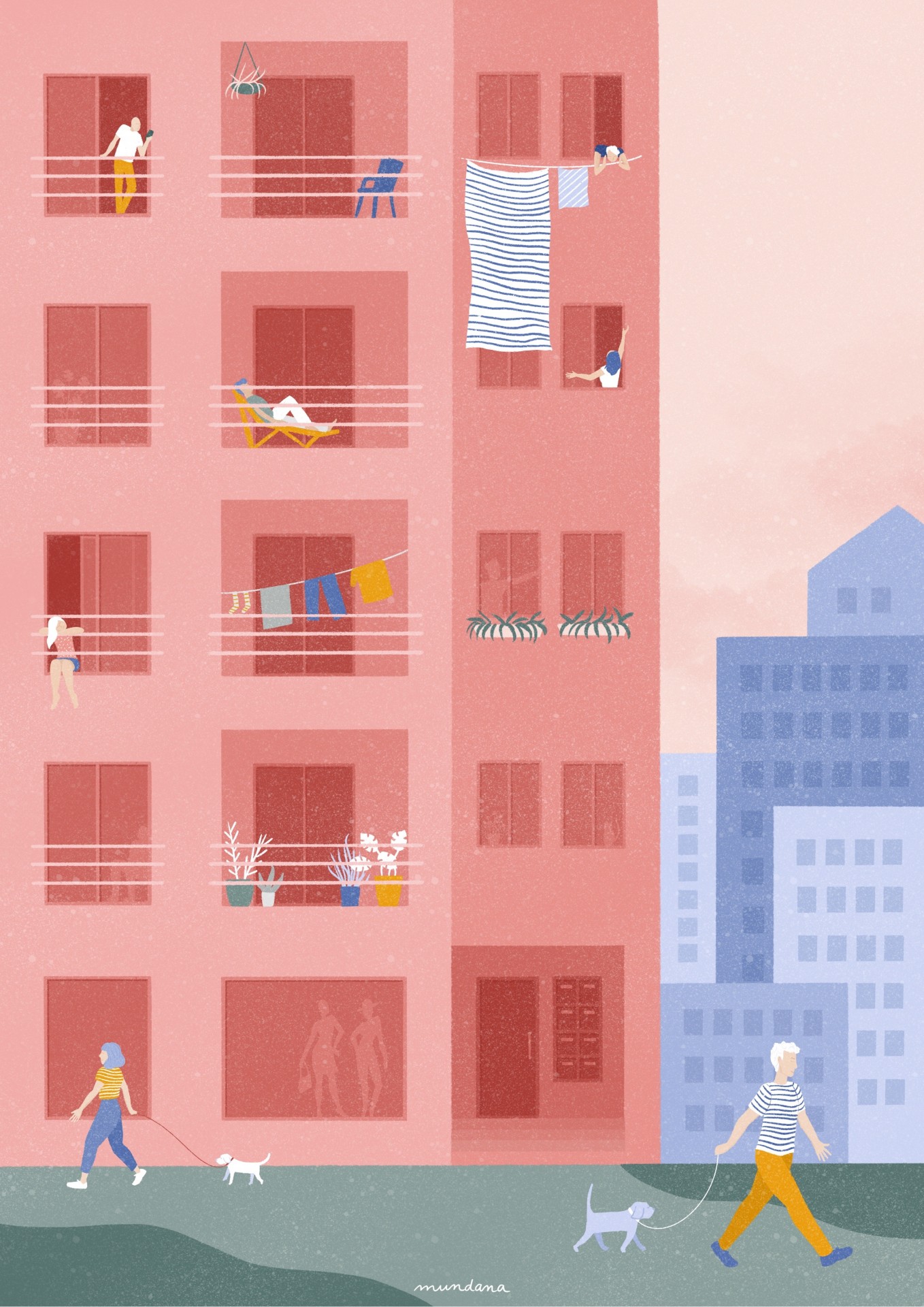 • Edifício cor-de-rosa com janelas, varandas, pessoas e cães na rua