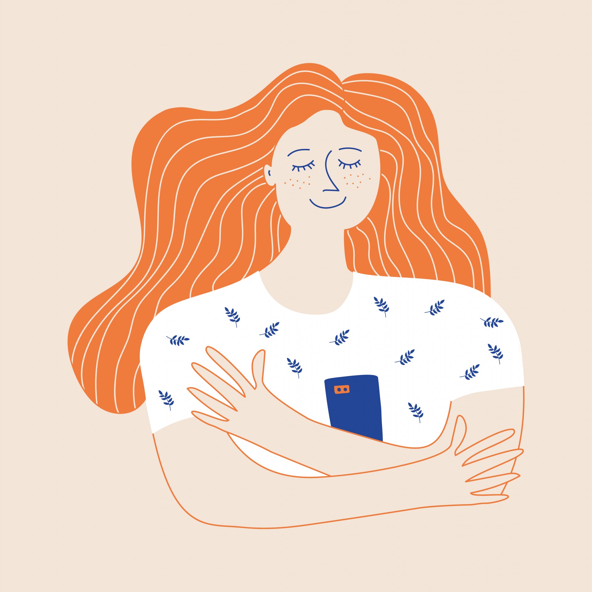 Mulher ruiva com t-shirt branca e telemóvel azul