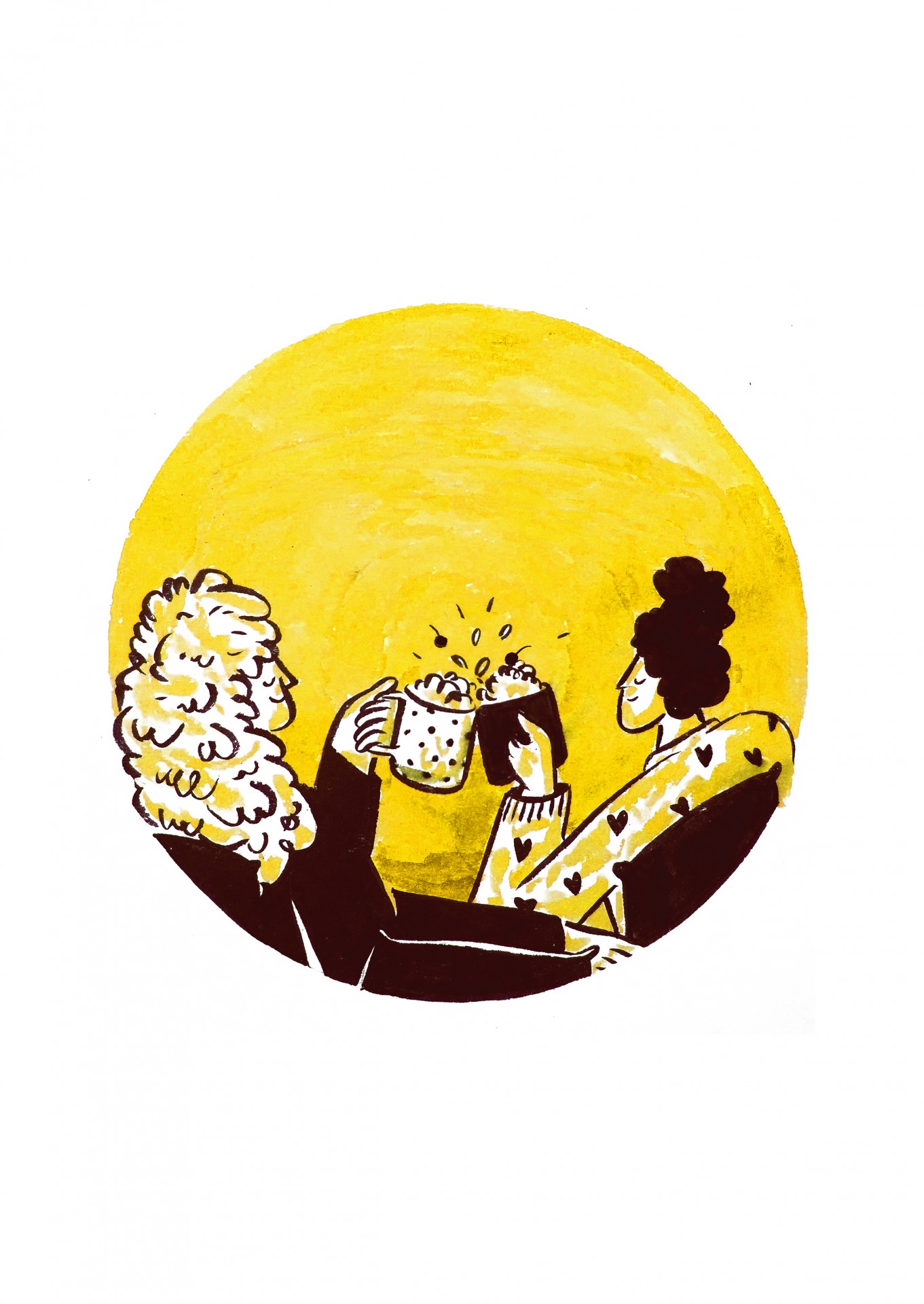 • Dupla brindando com canecas com fundo amarelo redondo
