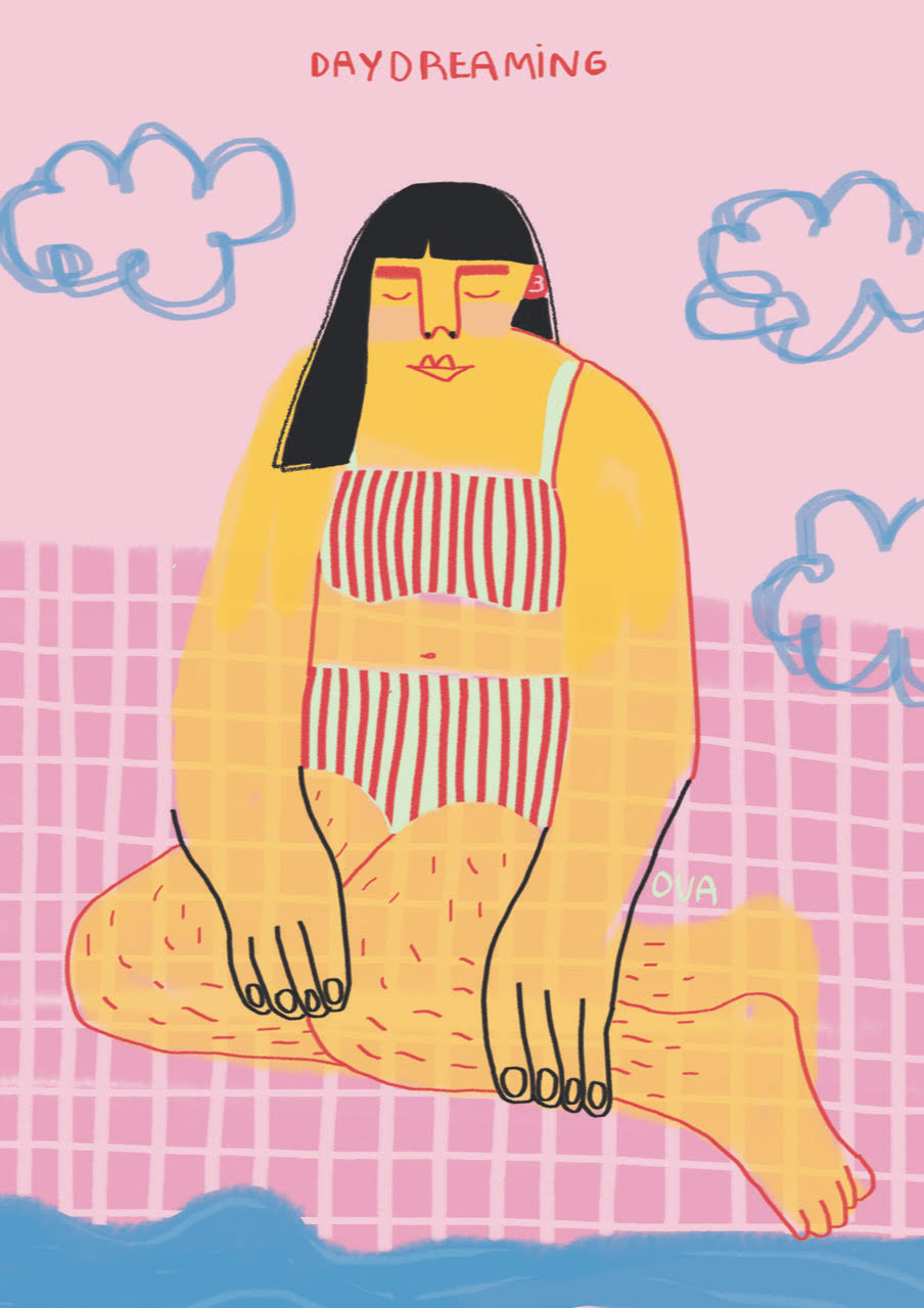 • Ilustração de mulher sentada com biquíni às riscas vermelhas e brancas, fundo rosa e texto DAYDREAMING