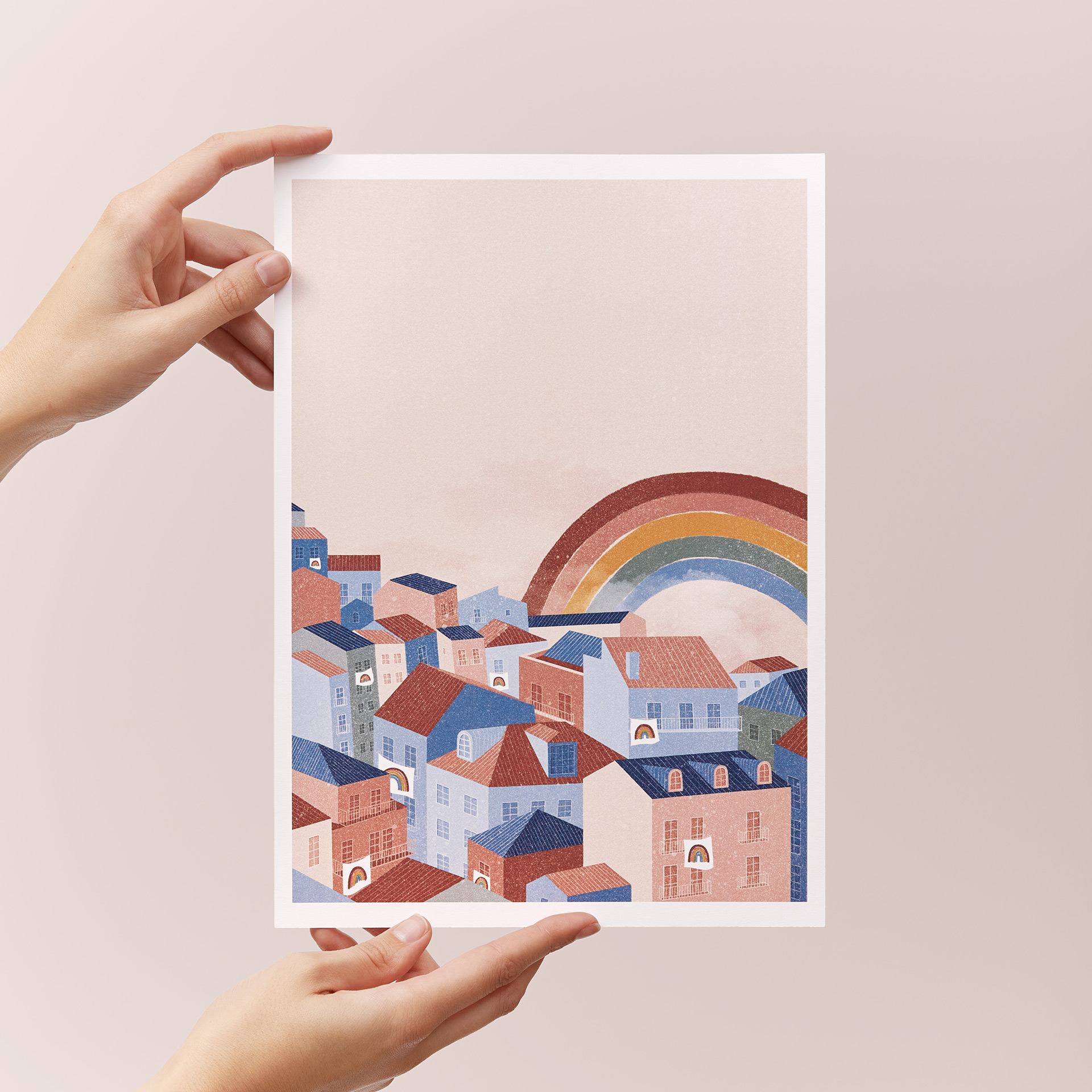 • Cartaz com ilustração de casas coloridas e arco-íris em fundo rosa
