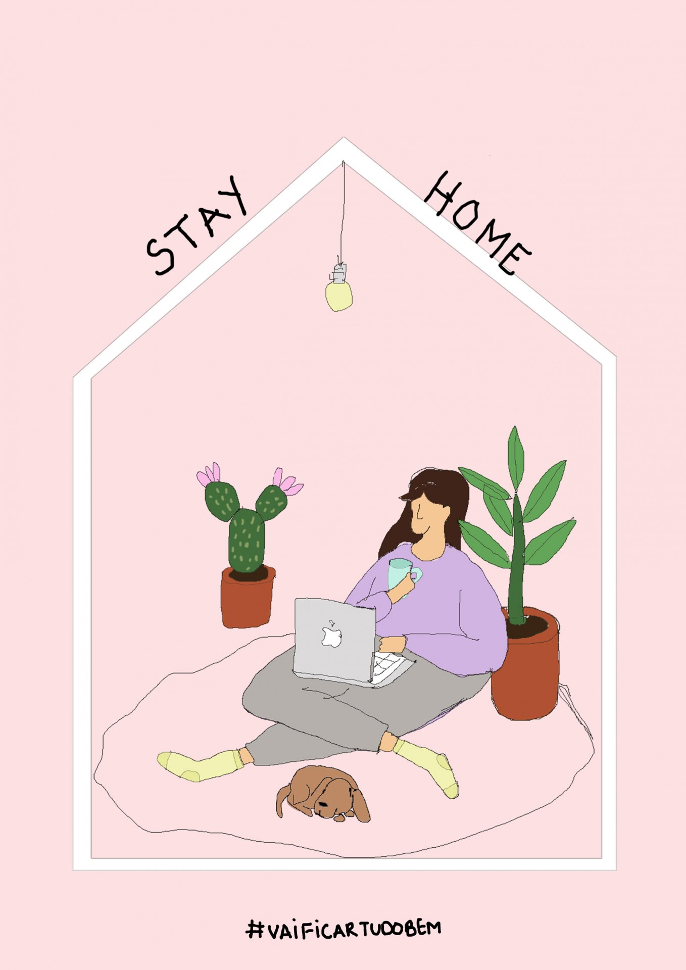 • Ilustração de pessoa em casa com plantas, cão, computador e texto motivacional.