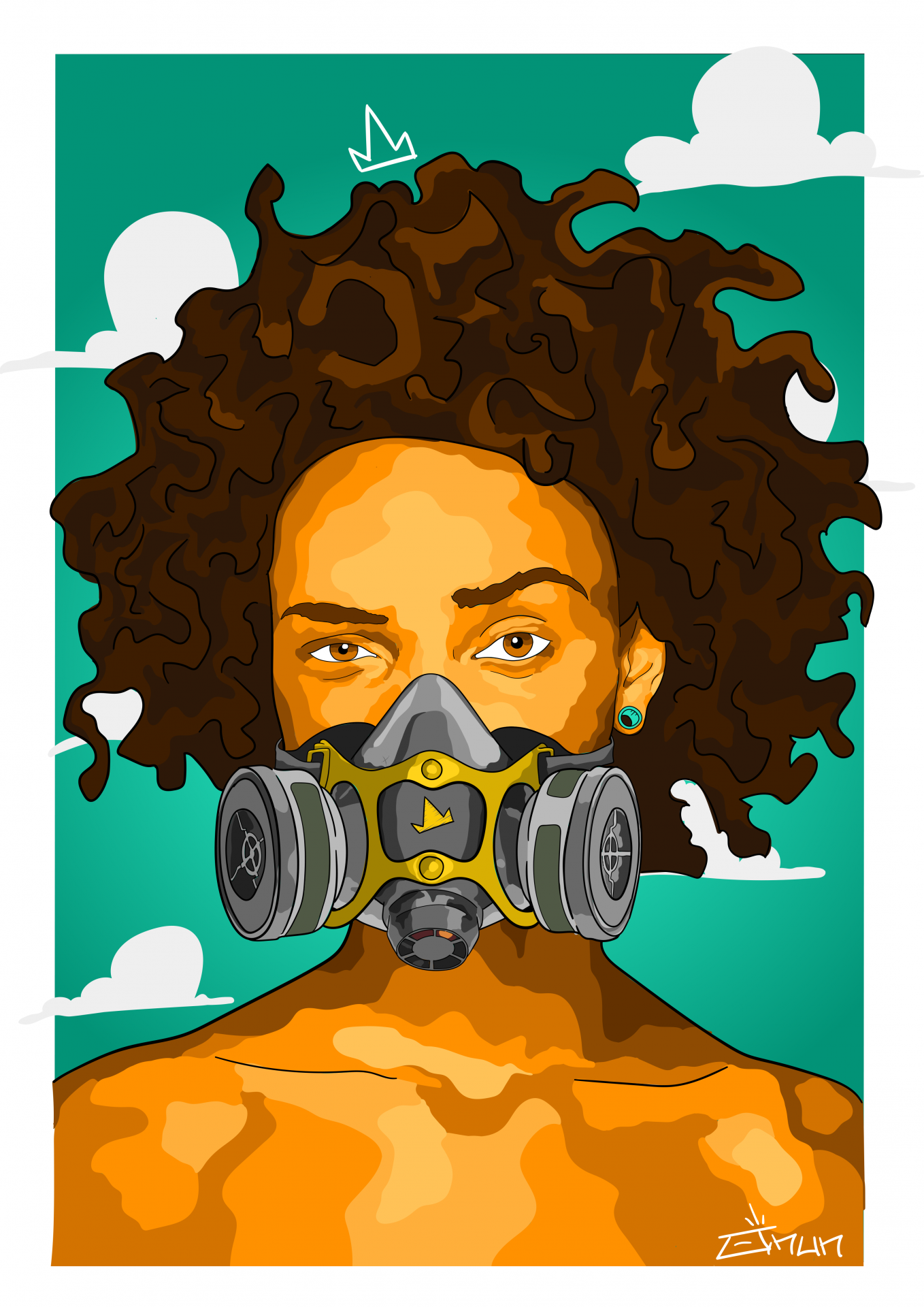 • Pessoa com máscara de proteção de gás cinza e amarelo sobre fundo verde com nuvens