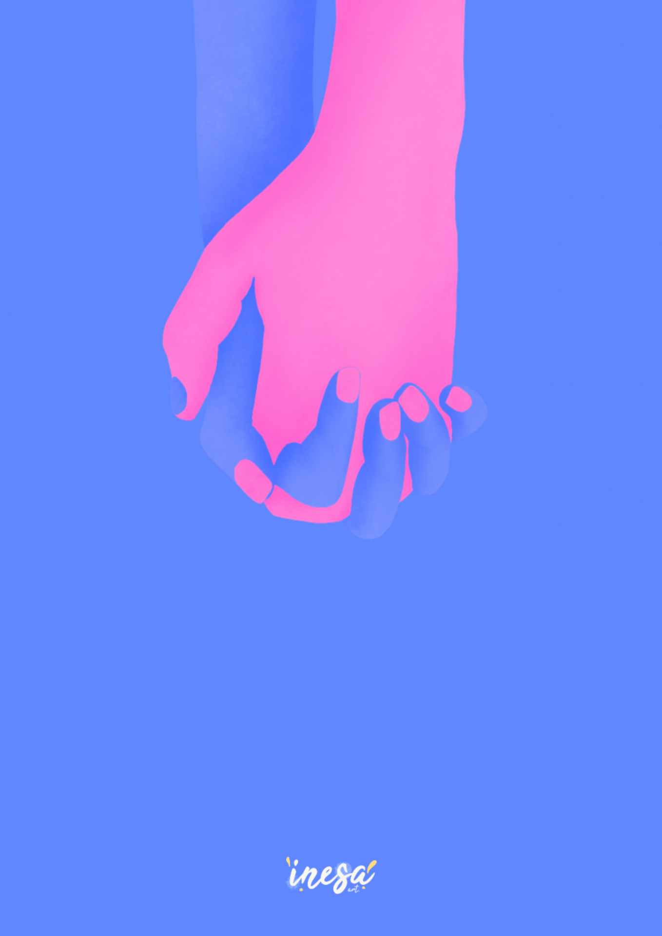 • Duas mãos dadas em cores rosa e azul com fundo azul e a palavra 'inesa' no canto inferior.