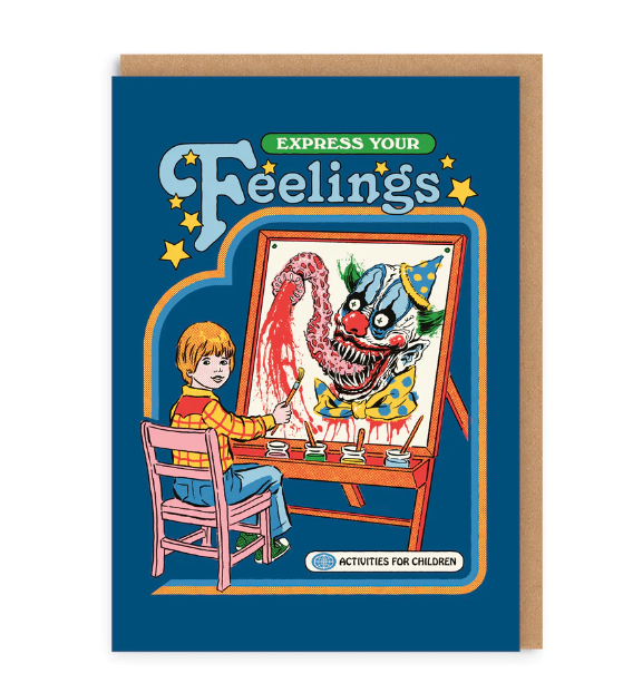 Cartão ilustrado com criança pintando palhaço assustador, texto EXPRESS YOUR Feelings.