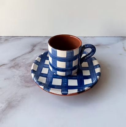 • chávena e pires em cerâmica com padrão xadrez azul e branco