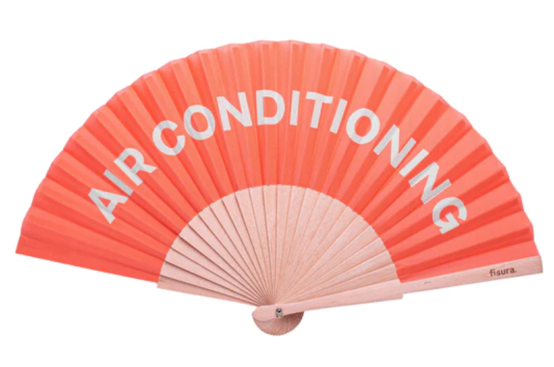 Leque de tecido laranja com madeira clara e texto branco AIR CONDITIONING.
